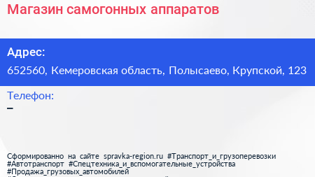 Магазин самогонных аппаратов по адресу 652560, Кемеровская область, Полысаево, Крупской, 123 в дальнейшем Организация, размещена в следующих категориях: