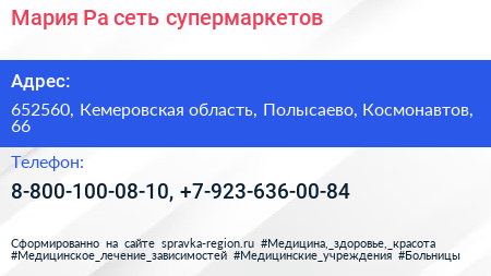 Мария-Ра, сеть супермаркетов по адресу 652560, Кемеровская область, Полысаево, Космонавтов, 66 в дальнейшем Организация, размещена в следующих категориях: