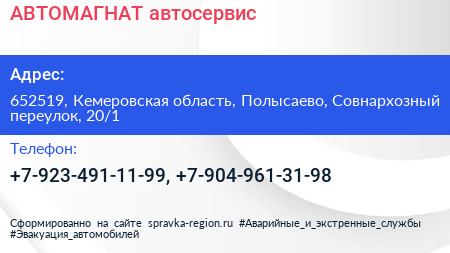 АВТОМАГНАТ, автосервис по адресу 652519, Кемеровская область, Полысаево, Совнархозный переулок, 20/1 в дальнейшем Организация, размещена в следующих категориях: