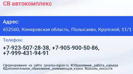 СВ, автокомплекс по адресу 652560, Кемеровская область, Полысаево, Крупской, 11/1 в дальнейшем Организация, размещена в следующих категориях: