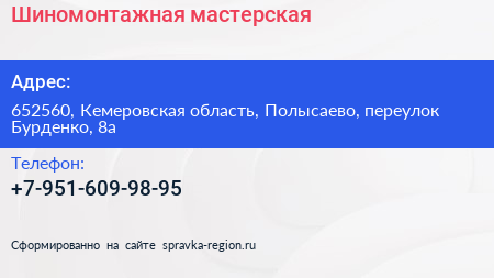 Шиномонтажная мастерская по адресу 652560, Кемеровская область, Полысаево, переулок Бурденко, 8а в дальнейшем Организация, размещена в следующих категориях: