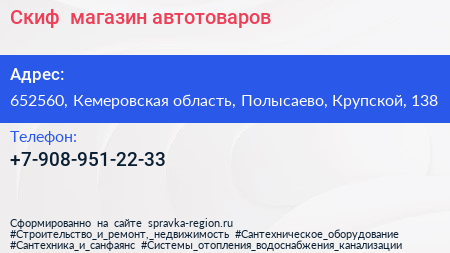 Скиф+, магазин автотоваров по адресу 652560, Кемеровская область, Полысаево, Крупской, 138 в дальнейшем Организация, размещена в следующих категориях: