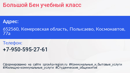 Большой Бен, учебный класс по адресу 652560, Кемеровская область, Полысаево, Космонавтов, 77а в дальнейшем Организация, размещена в следующих категориях: