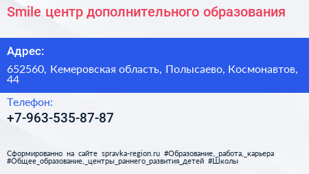 Smile, центр дополнительного образования по адресу 652560, Кемеровская область, Полысаево, Космонавтов, 44 в дальнейшем Организация, размещена в следующих категориях: