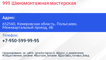 999, Шиномонтажная мастерская по адресу 652560, Кемеровская область, Полысаево, Межквартальный проезд, 6Б в дальнейшем Организация, размещена в следующих категориях: