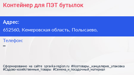 Контейнер для ПЭТ бутылок по адресу 652560, Кемеровская область, Полысаево, в дальнейшем Организация, размещена в следующих категориях: