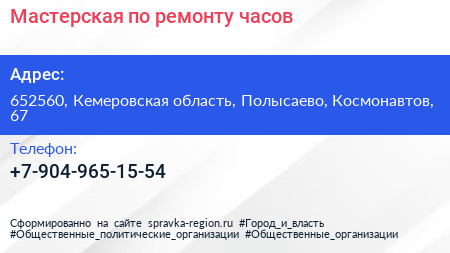 Мастерская по ремонту часов по адресу 652560, Кемеровская область, Полысаево, Космонавтов, 67 в дальнейшем Организация, размещена в следующих категориях: