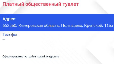 Платный общественный туалет по адресу 652560, Кемеровская область, Полысаево, Крупской, 116а в дальнейшем Организация, размещена в следующих категориях: