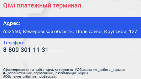 Qiwi, платежный терминал по адресу 652560, Кемеровская область, Полысаево, Крупской, 127 в дальнейшем Организация, размещена в следующих категориях: