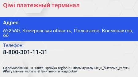 Qiwi, платежный терминал по адресу 652560, Кемеровская область, Полысаево, Космонавтов, 66 в дальнейшем Организация, размещена в следующих категориях:
