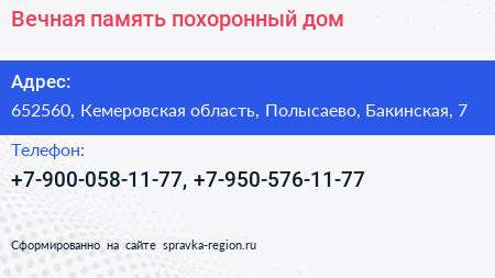 Вечная память, похоронный дом по адресу 652560, Кемеровская область, Полысаево, Бакинская, 7 в дальнейшем Организация, размещена в следующих категориях: