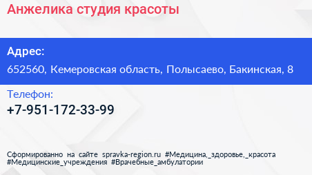 Анжелика, студия красоты по адресу 652560, Кемеровская область, Полысаево, Бакинская, 8 в дальнейшем Организация, размещена в следующих категориях: