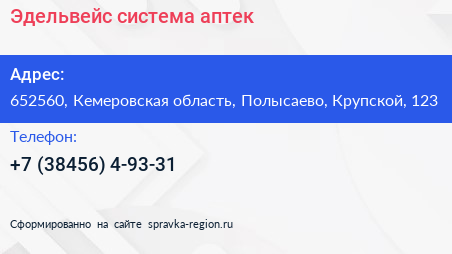 Эдельвейс, система аптек по адресу 652560, Кемеровская область, Полысаево, Крупской, 123 в дальнейшем Организация, размещена в следующих категориях: