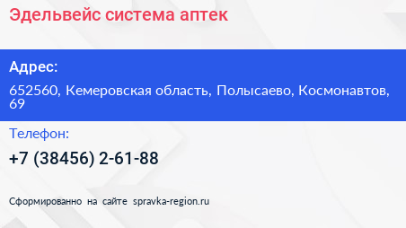 Эдельвейс, система аптек по адресу 652560, Кемеровская область, Полысаево, Космонавтов, 69 в дальнейшем Организация, размещена в следующих категориях: