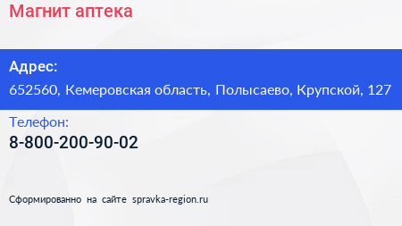 Магнит, аптека по адресу 652560, Кемеровская область, Полысаево, Крупской, 127 в дальнейшем Организация, размещена в следующих категориях: