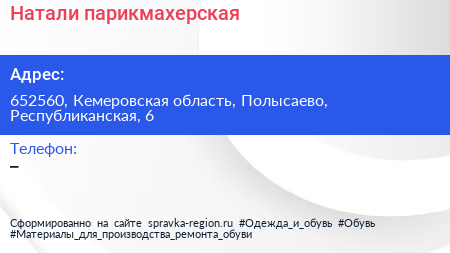 Натали, парикмахерская по адресу 652560, Кемеровская область, Полысаево, Республиканская, 6 в дальнейшем Организация, размещена в следующих категориях: