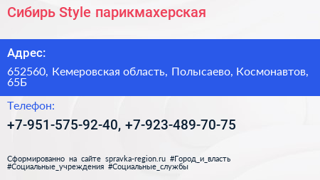 Сибирь Style, парикмахерская по адресу 652560, Кемеровская область, Полысаево, Космонавтов, 65Б в дальнейшем Организация, размещена в следующих категориях: