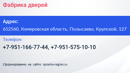 Фабрика дверей по адресу 652560, Кемеровская область, Полысаево, Крупской, 127 в дальнейшем Организация, размещена в следующих категориях: