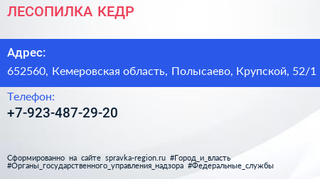 ЛЕСОПИЛКА КЕДР по адресу 652560, Кемеровская область, Полысаево, Крупской, 52/1 в дальнейшем Организация, размещена в следующих категориях: