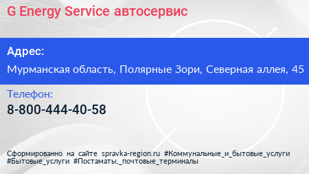 G-Energy Service, автосервис по адресу Мурманская область, Полярные Зори, Северная аллея, 45 в дальнейшем Организация, размещена в следующих категориях: