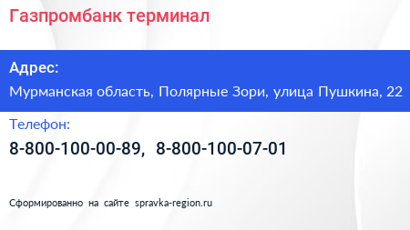 Газпромбанк, терминал по адресу Мурманская область, Полярные Зори, улица Пушкина, 22 в дальнейшем Организация, размещена в следующих категориях: