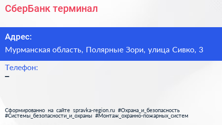 СберБанк, терминал по адресу Мурманская область, Полярные Зори, улица Сивко, 3 в дальнейшем Организация, размещена в следующих категориях: