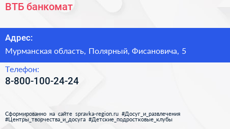 ВТБ, банкомат по адресу Мурманская область, Полярный, Фисановича, 5 в дальнейшем Организация, размещена в следующих категориях: