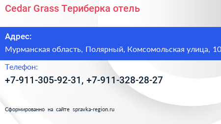 Cedar Grass Териберка, отель по адресу Мурманская область, Полярный, Комсомольская улица, 10 в дальнейшем Организация, размещена в следующих категориях: