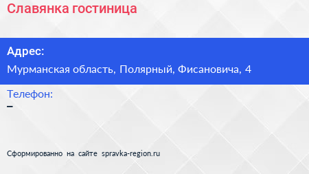 Славянка, гостиница по адресу Мурманская область, Полярный, Фисановича, 4 в дальнейшем Организация, размещена в следующих категориях: