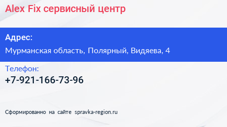 Alex-Fix, сервисный центр по адресу Мурманская область, Полярный, Видяева, 4 в дальнейшем Организация, размещена в следующих категориях: