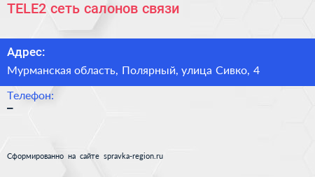 TELE2, сеть салонов связи по адресу Мурманская область, Полярный, улица Сивко, 4 в дальнейшем Организация, размещена в следующих категориях: