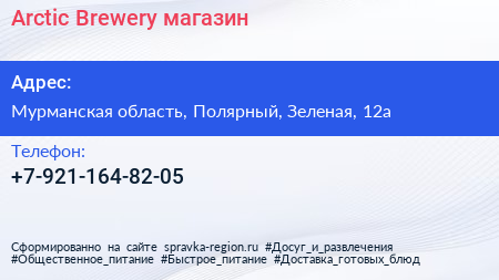 Arctic Brewery, магазин по адресу Мурманская область, Полярный, Зеленая, 12а в дальнейшем Организация, размещена в следующих категориях: