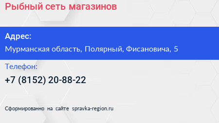Рыбный, сеть магазинов по адресу Мурманская область, Полярный, Фисановича, 5 в дальнейшем Организация, размещена в следующих категориях: