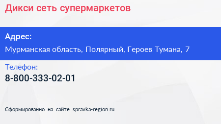 Дикси, сеть супермаркетов по адресу Мурманская область, Полярный, Героев Тумана, 7 в дальнейшем Организация, размещена в следующих категориях: