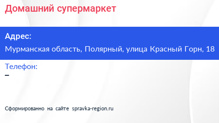 Домашний, супермаркет по адресу Мурманская область, Полярный, улица Красный Горн, 18 в дальнейшем Организация, размещена в следующих категориях: