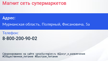Магнит, сеть супермаркетов по адресу Мурманская область, Полярный, Фисановича, 5а в дальнейшем Организация, размещена в следующих категориях: