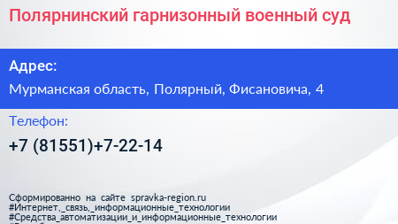 Полярнинский гарнизонный военный суд по адресу Мурманская область, Полярный, Фисановича, 4 в дальнейшем Организация, размещена в следующих категориях: