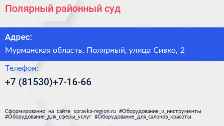 Полярный районный суд по адресу Мурманская область, Полярный, улица Сивко, 2 в дальнейшем Организация, размещена в следующих категориях: