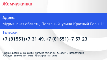 Жемчужинка по адресу Мурманская область, Полярный, улица Красный Горн, 11 в дальнейшем Организация, размещена в следующих категориях: