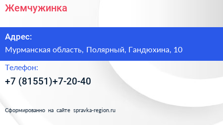 Жемчужинка по адресу Мурманская область, Полярный, Гандюхина, 10 в дальнейшем Организация, размещена в следующих категориях: