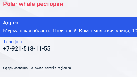 Polar whale, ресторан по адресу Мурманская область, Полярный, Комсомольская улица, 10 в дальнейшем Организация, размещена в следующих категориях: