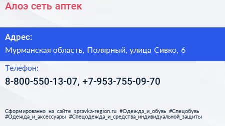 Алоэ, сеть аптек по адресу Мурманская область, Полярный, улица Сивко, 6 в дальнейшем Организация, размещена в следующих категориях: