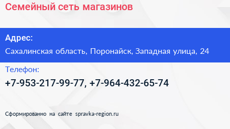 Семейный, сеть магазинов по адресу Сахалинская область, Поронайск, Западная улица, 24 в дальнейшем Организация, размещена в следующих категориях: