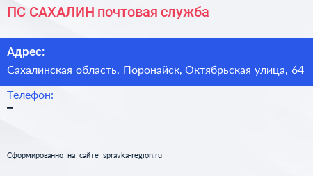 ПС-САХАЛИН, почтовая служба по адресу Сахалинская область, Поронайск, Октябрьская улица, 64 в дальнейшем Организация, размещена в следующих категориях: