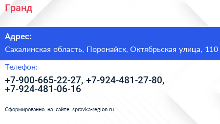 Гранд по адресу Сахалинская область, Поронайск, Октябрьская улица, 110 в дальнейшем Организация, размещена в следующих категориях: