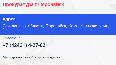 Прокуратура, г. Поронайск по адресу Сахалинская область, Поронайск, Комсомольская улица, 11 в дальнейшем Организация, размещена в следующих категориях: