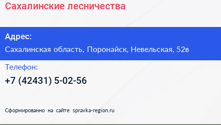 Сахалинские лесничества по адресу Сахалинская область, Поронайск, Невельская, 52в в дальнейшем Организация, размещена в следующих категориях: