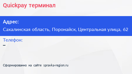 Quickpay, терминал по адресу Сахалинская область, Поронайск, Центральная улица, 62 в дальнейшем Организация, размещена в следующих категориях: