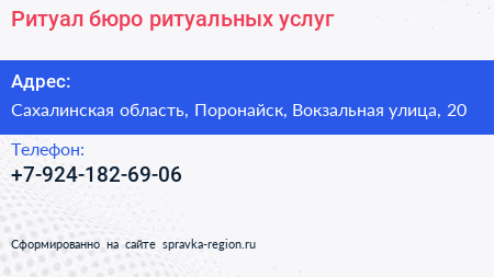 Ритуал, бюро ритуальных услуг по адресу Сахалинская область, Поронайск, Вокзальная улица, 20 в дальнейшем Организация, размещена в следующих категориях: