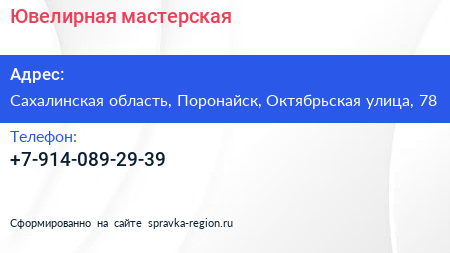Ювелирная мастерская по адресу Сахалинская область, Поронайск, Октябрьская улица, 78 в дальнейшем Организация, размещена в следующих категориях: